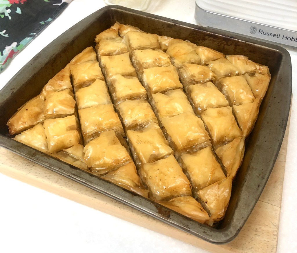 - While the baklava is cooking, melt all of the syrup ingredients with 200ml water, stirring until the sugar has dissolved, then boil for 10 minutes to reduce and thicken.