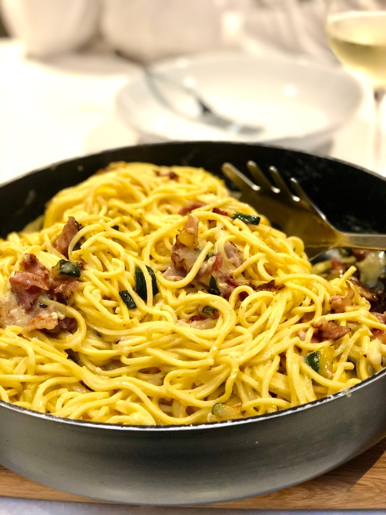 - Quickly toss the spaghetti in the bacon/courgettes to coat with the fat from the pan while still on the heat.