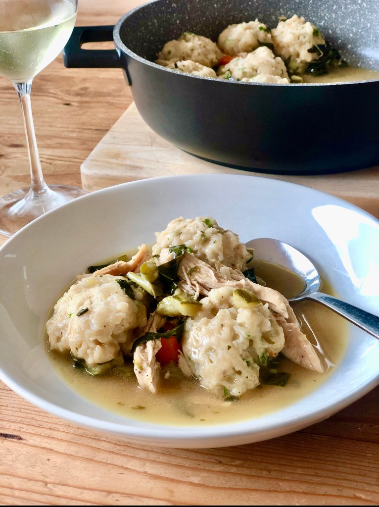 This is basically a vegetable soup with leftover chicken (often I just pan fry some skinless boneless chicken thighs first), but it could easily be made into a veggie version, and you can use different herbs depending on what you have to hand. Whichever way you make it, it’s delicious and straightforward. Flinging the casserole into a hot oven would crisp up the top of the dumplings if that floats your boat, but personally I enjoy the squidge. Serves 4.