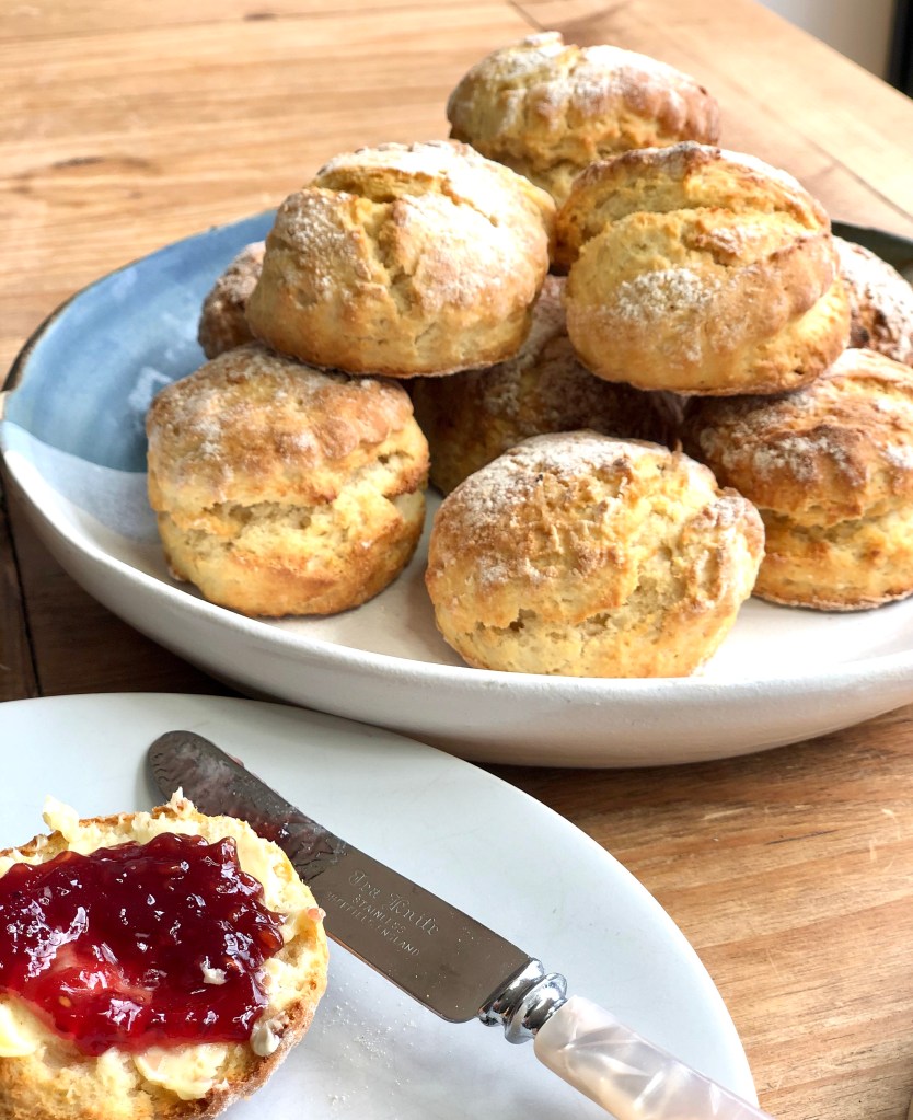 Is it scone as in bone, or scone as in gone? Jam then cream or cream then jam? How such a simple food can cause so much debate I do not know, but what I do know is that it’s a scone until it’s gone (I’m here all week folks!). My Mum used to make scones on a Sunday early evening for tea when we were little, and I still treat them as comfort food at the end of a busy weekend. This makes about 14 scones. They freeze excellently and then can be whacked in the microwave briefly and then voila! A lovely warm scone can be yours anytime.