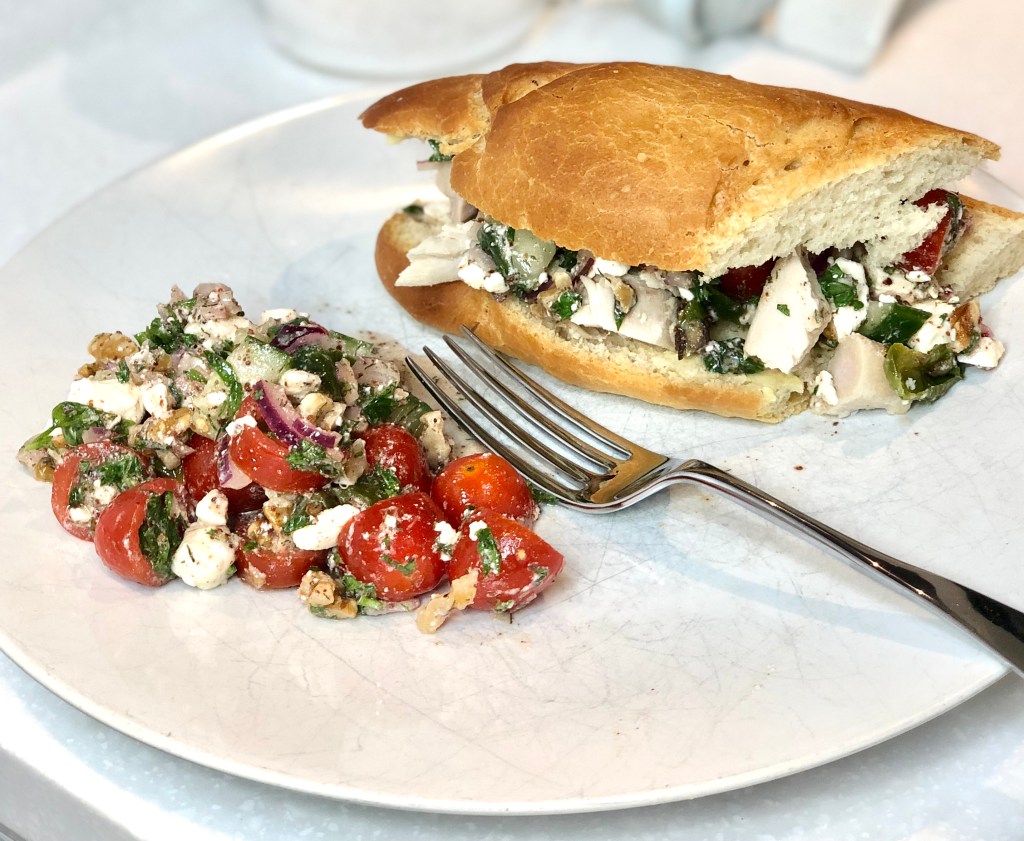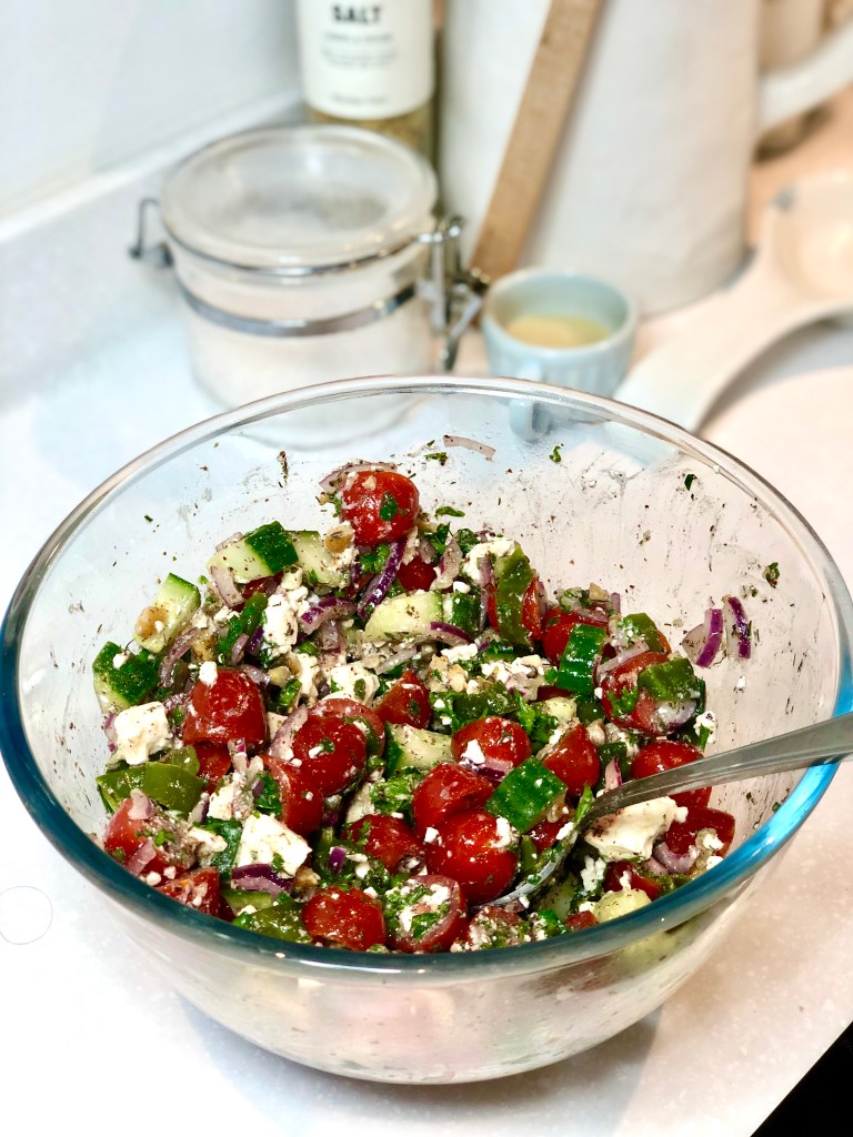 I know I know, it’s kind of like a Greek salad, but there are some differences (namely walnuts, sumac, dill + mint). I’d happily eat this for lunch every day with some fresh bread, or in the evening alongside some fish or chicken, a glass of rose and preferably a sunset or sea view! (Note that I’ve roasted my green peppers (these were padron peppers) for 20 minutes with a little olive oil and sea salt because raw peppers just don’t agree with me. And any kind of tomatoes will do).