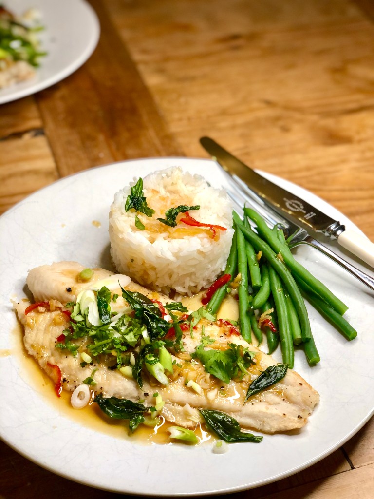 - When the fish is ready, serve with rice and veg, and spoon over the sticky sauce. Sprinkle with coriander, spring onions and your crispy Thai basil.