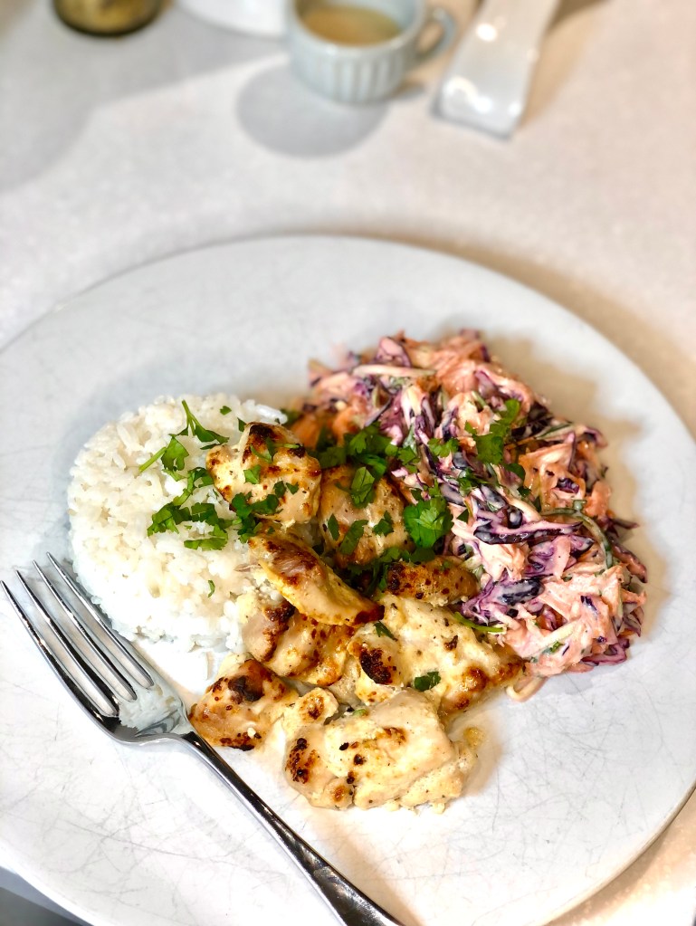 Winner winner chicken dinner. A little forward prep is needed with this one (to marinate the chicken), but then it’s easy peasy. Whole chicken thighs with bone in + skin on work well too, but this time around I’ve cut boneless chicken into pieces. The coleslaw is zingy and delicious and onion free for those who don’t like raw onion. All in all it’s excellent (thanks Diana Henry!) and super colourful. Serves 4.