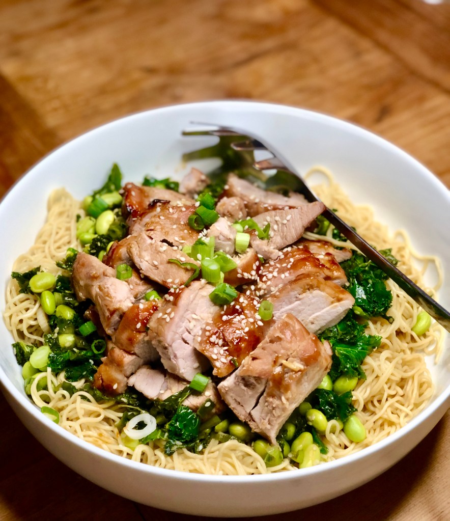 - To serve, layer up the noodles and greenery, then slice the pork and place it on top. Scatter over the remaining onions and a few more sesame seeds.