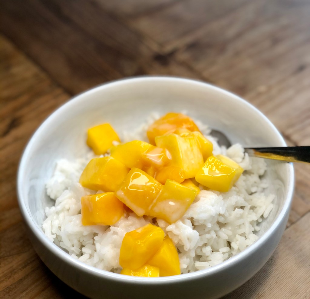 When I was a 22 year old pipsqueak I got on a plane and headed off to Thailand to teach English. While there I ate my first ever mango, and discovered one of my favourite ways to eat said mango, being with coconut rice. For all of 20 baht (50p) you were handed a polystyrene takeaway box, spoon, copious amounts of sticky coconut rice, half a chopped up mango and the world’s sweetest coconut sauce. This recipe is the closest thing I’ve managed to make, and it’s yummy. Now if someone can explain to me how 1996 is 25 years ago I’d be very grateful, because it feels like yesterday.