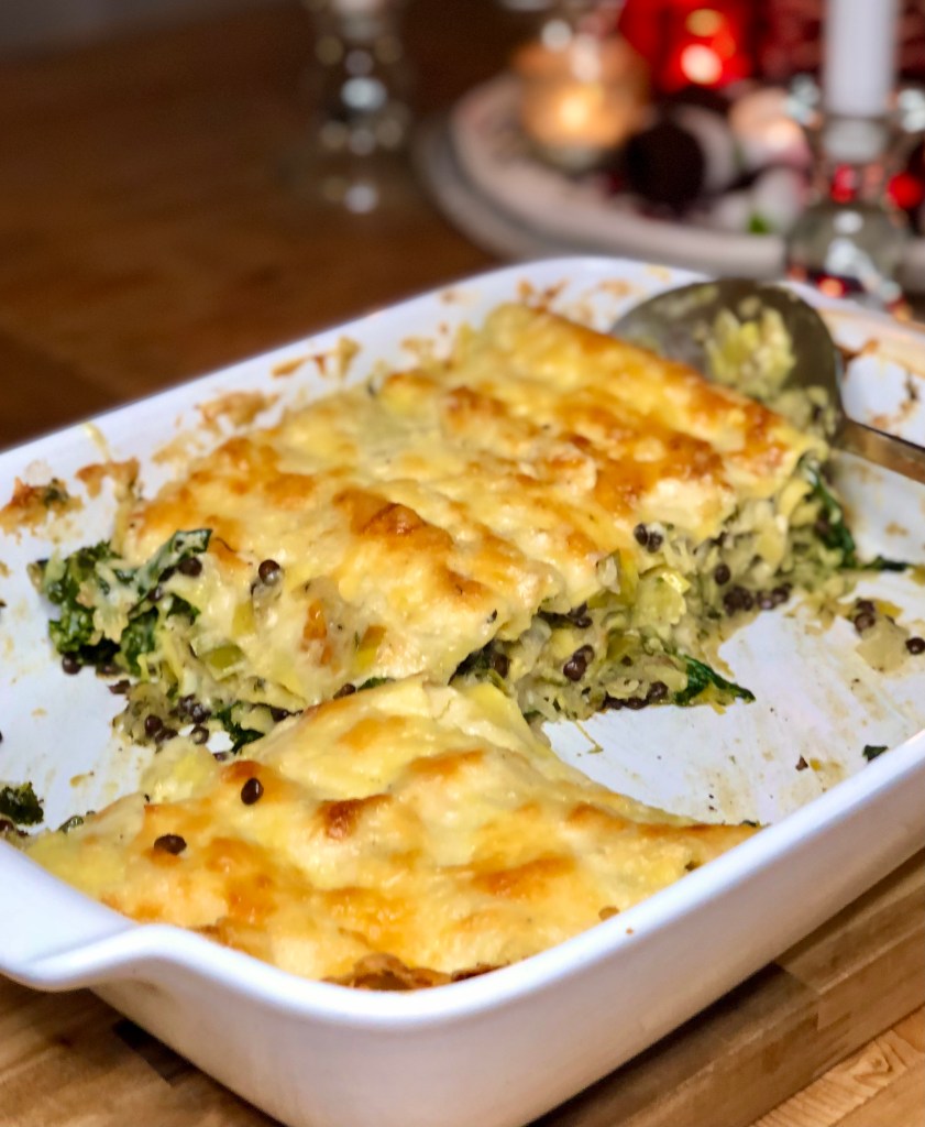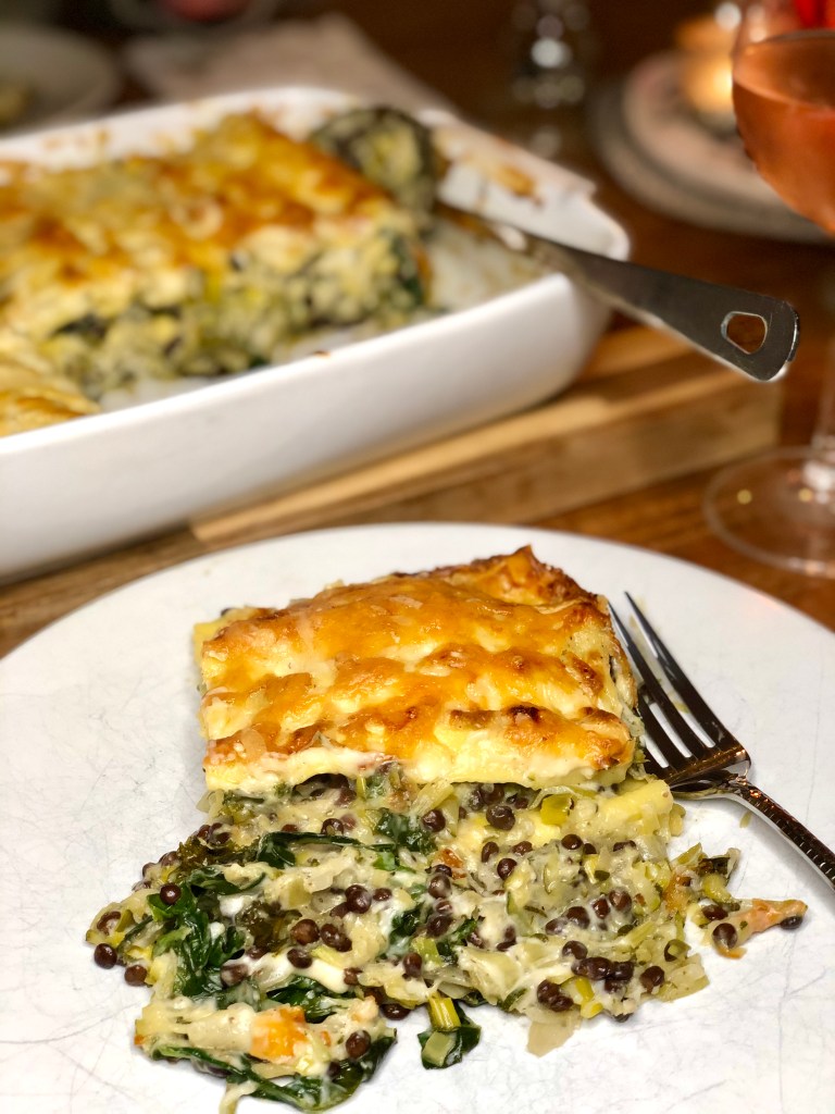 I’m going to go out on a limb here and say that I think I might actually prefer this lasagne to the normal meaty version that I make, it’s really that yummy. As with all lasagnes (lasagni?) it takes a while to make, but it’s deffo worth taking the time to infuse the milk before making the béchamel. If you can get your hands on lasagne verdi then do! The more green the better. Serves 6.