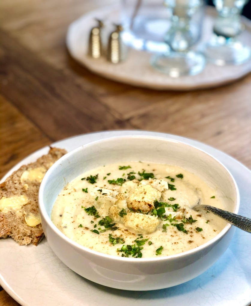 Soooooup glorious soooooooup, this one is delicious and takes less than 30 minutes to make. Yummo. The versatility of cauliflower never ceases to amaze me, and this recipe really shows it at its best, esp on a cold wintery day. Homemade soda bread is optional, but it takes very little effort and time so I’d suggest you try making some (yes I have a recipe for that too!). Serves 4 easily.
