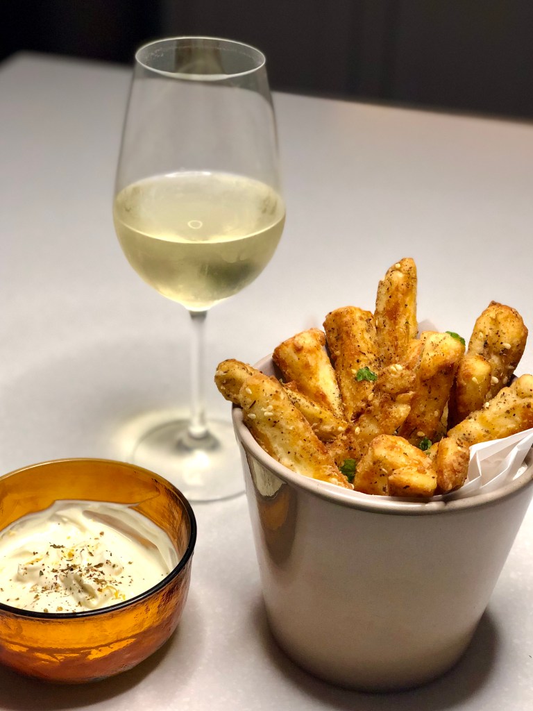 - Slice the halloumi into chunky chip sized pieces and put them in the flour, tossing to coat completely on all sides.