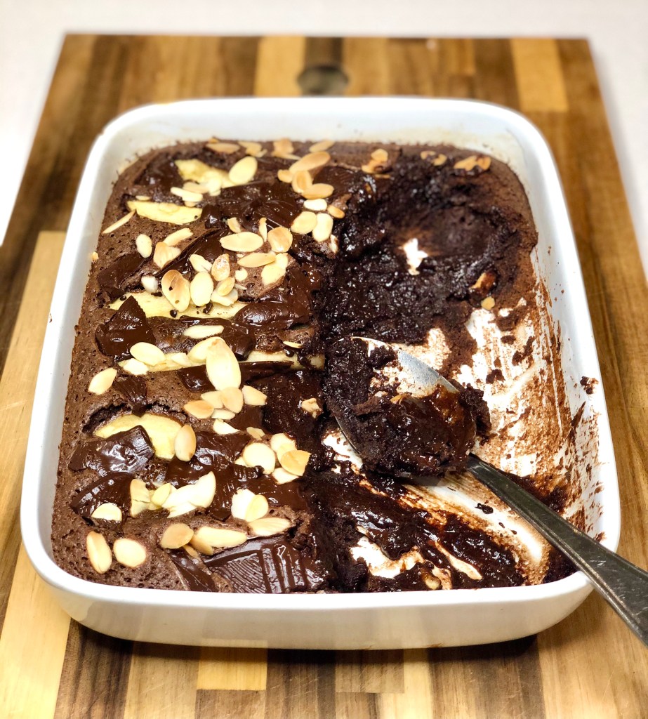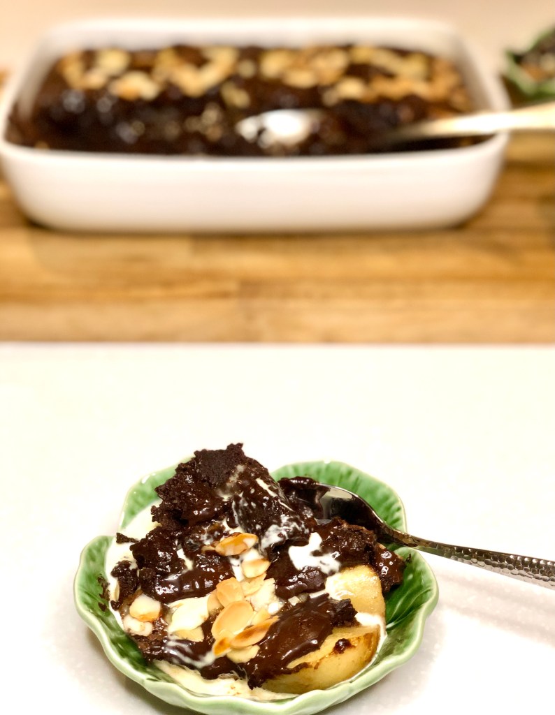 Uh-oh. This may well be the most amazing pudding EVER. Squidgy chocolateyness with pears, flaked almonds for a bit of crunch, and then more chocolate. Enter at your peril! Just to top it all off it can be prepared in advance and frozen as a whole or in portions, then flung into the oven when required. And then (there’s more) it’s utterly lovely eaten cold, in a brownie styleee. You have been warned. When we’re finally allowed to have friends & family over for dinner this is the pud I will make. Serves 8.
