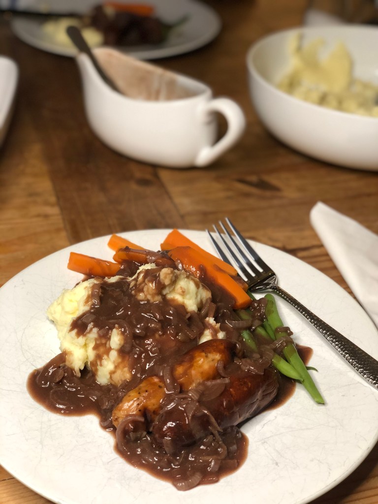 Way way way back in 1999, we spent Millennium Eve in London partying with my younger sister and a bunch of her friends, and the evening started with this meal (it ended up by Tower Bridge watching fireworks and dancing the night away). Anyway, what we learnt that night is that it’s all about the gravy, incredibly tasty onion gravy, and that’s the star of the show here. Serves 4.