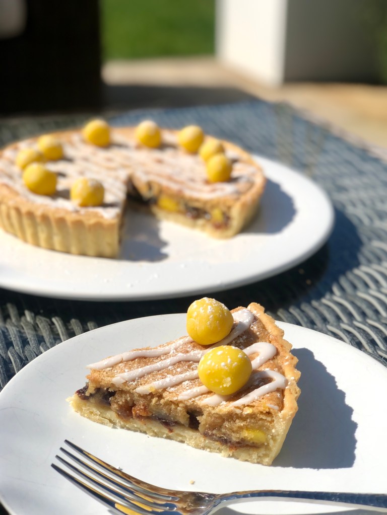 - When the tart is cold, either pipe or drizzle over the icing, then top with the rest of the marzipan after rolling it into 11 balls, and dust with a little extra icing sugar.