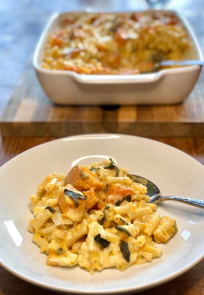 - Tip the pasta, roasted squash, and sauce into a large baking dish, mix well and scatter over the remaining cheese and sage leaves.