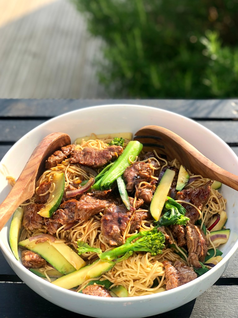 I think my favourite thing about a stir fry is that so long as you have some noodles and sauces in your cupboard and any kind of veg in the fridge, you can rustle up some delicious food in seemingly no time at all. This one is from Uyen Luu’s wonderful Vietnamese book, and the marinated beef is tender and tasty – this went down a storm with The Teen, so I think its going to become a mid-week staple for us. Serves 4.