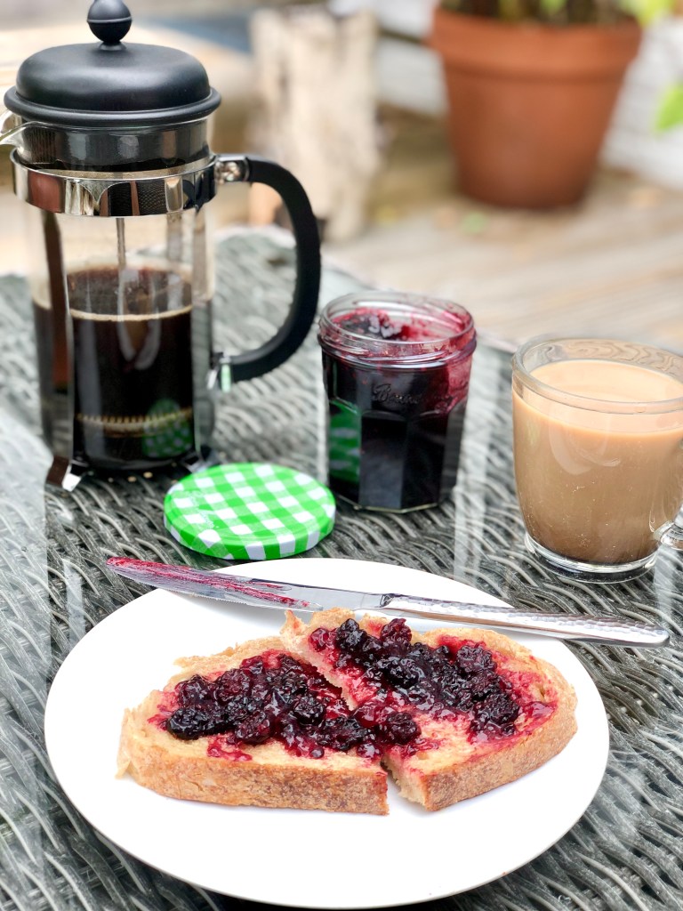 It’s blackberry season in the UK, so I seem to return from almost every woofer walk clutching a bag full of juicy ripe fruit and sticky fingers. Even The Teen enjoys a spot of blackberry picking which has meant that we’ve had some lovely long walks together, followed by me bubbling up a jammy storm in the kitchen. Making jam is really simple, but having the right bits of kit really help – a sugar thermometer that helpfully has a jam temperature marker takes out all of the guesswork so I’d highly recommend that, plus a stash of jam jars of course! Makes 4 – 5 standard jam jars full, but if you run out of jars then just keep the overflow in the fridge in whatever receptacle you have and munch away. Also if, like me, you find that you can’t pick an exact kilo of fruit, then just scale up or down the measurements accordingly (I had 660g of fruit and made 3 jars).