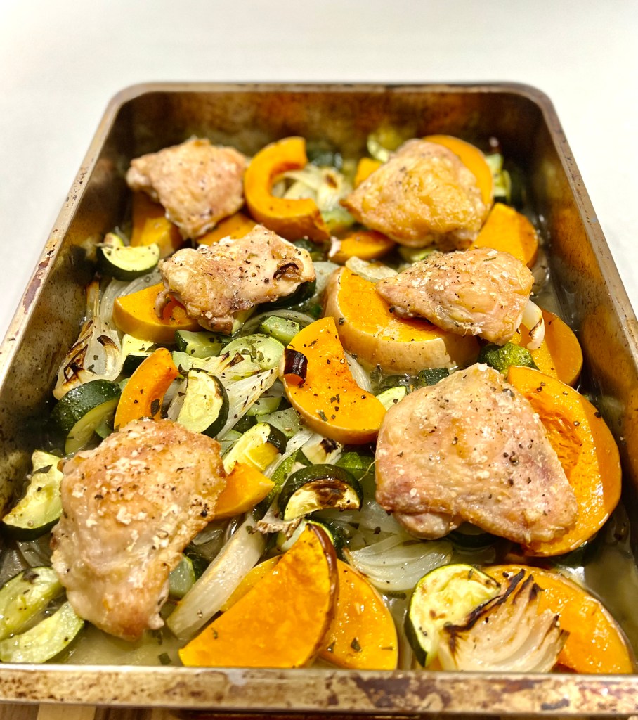 - Finally, trim off any gnarly looking weird bits from the chicken pieces, season them on both sides and place on top of the veg.