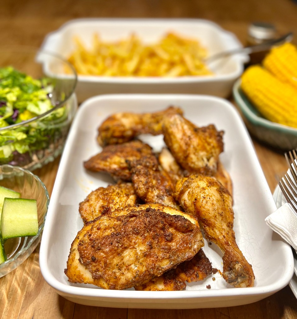 I’m always on the hunt for fun weekend food that I can make (rather than buy the fully processed version), and recently came across an article online that claimed to contain THE recipe for KFC, the actual special blend of herbs and spices that has been kept under lock and key forever. I couldn’t actually find all the ingredients, didn’t want to get messy with a batter, and didn’t want to deep fry anything, so instead I marinated the chicken briefly in the spice mix below and flung it in the oven. The result was not too shabby at all – although I’ve reduced the salt quantity by LOTS before making it again, and that’s the recipe below. This spice mix makes enough for 2 whole chickens, so I’d advise saving half in a jar and keeping it with your spice collection. It also works well on chicken flung onto the BBQ – there’s a photo of a rather good salad at the bottom of the page.