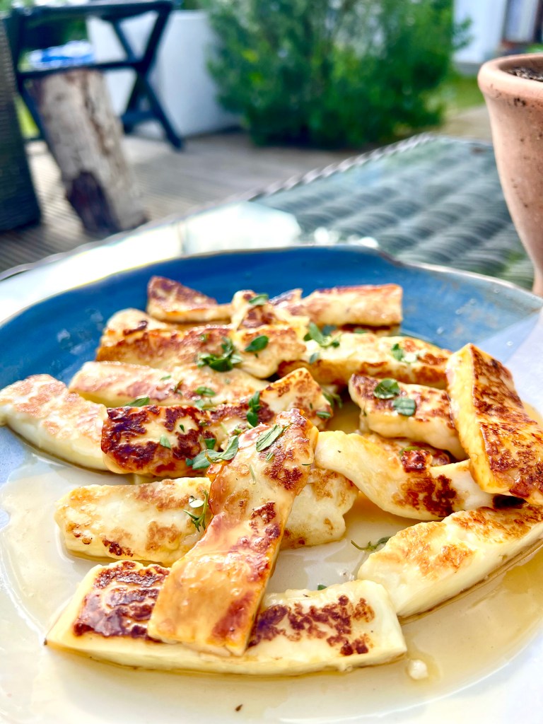 4. When you’re ready to eat, heat a frying pan and add half of the cheese (but retain the marinade) cooking on each side until dry, softened, and golden.