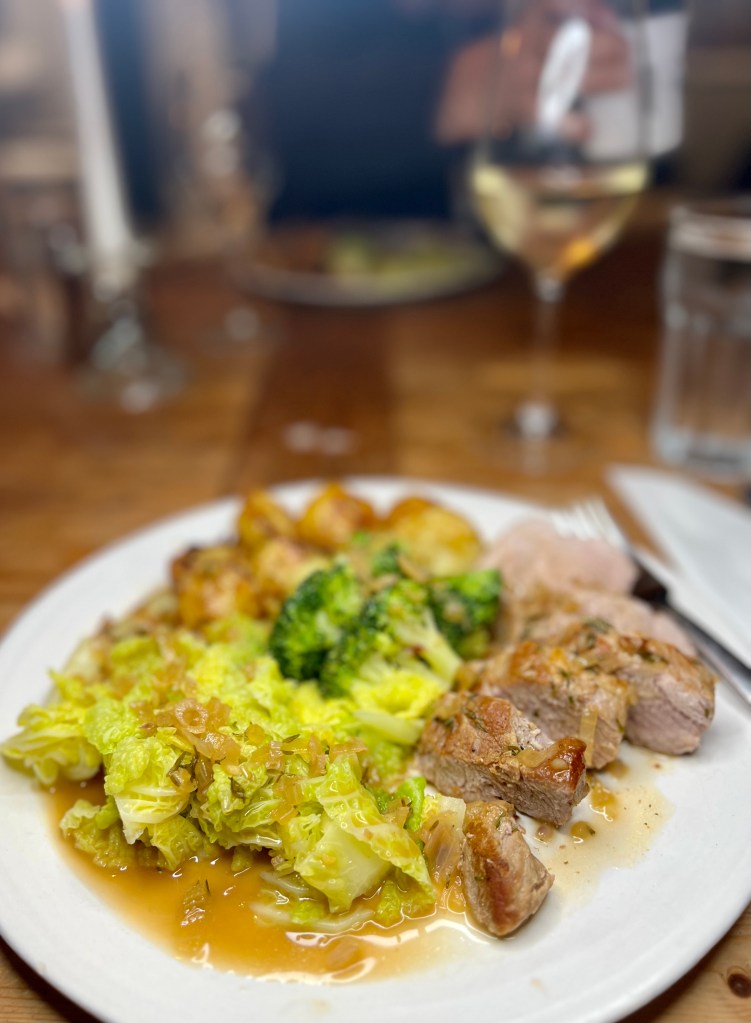 - Get someone to dish up the potatoes and your veg of choice (we had savoy cabbage and broccoli) while you cut the pork into thick slices, serve it all up and spoon over the sauce. Yummo.
