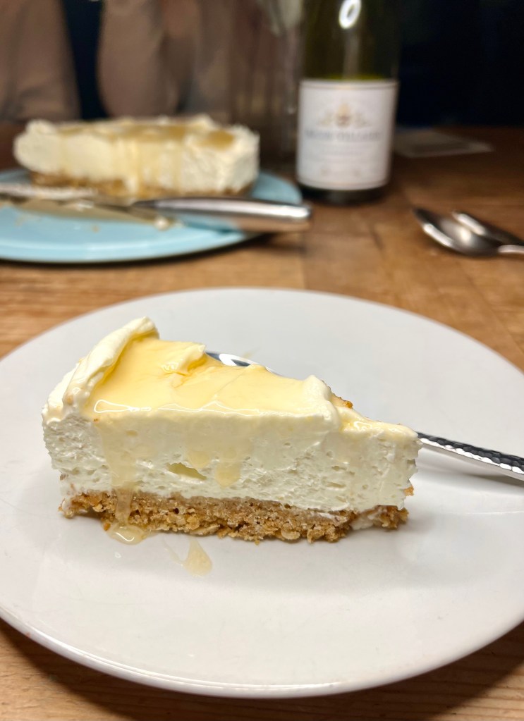 - Chill in the fridge for a couple of hours or until ready to serve. Gently extract the cheesecake from the tin, heat the honey in a small pan until pretty liquid and pour over the top.